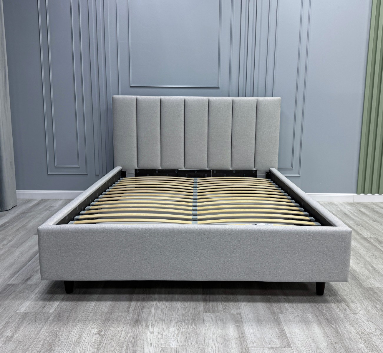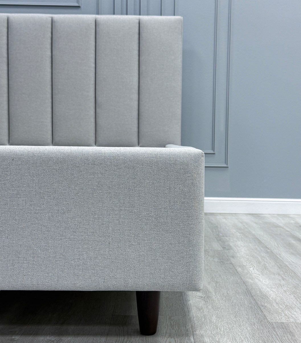 • Изголовье кровати выполнено вертикальными линиями. Данный дизайн актуален и отлично впишется в любой современный интерьер.